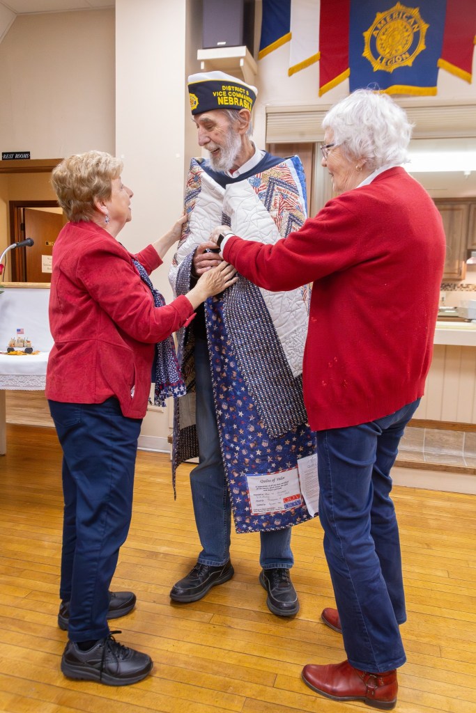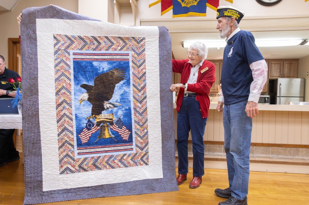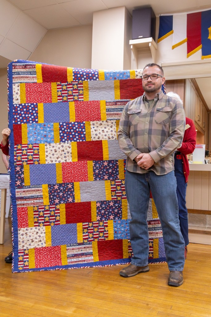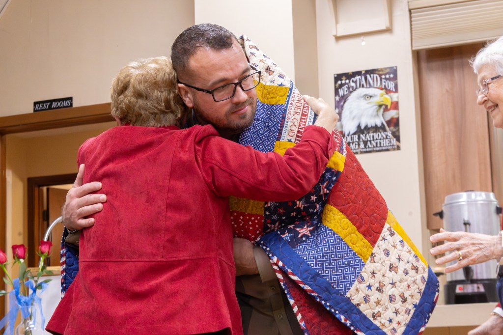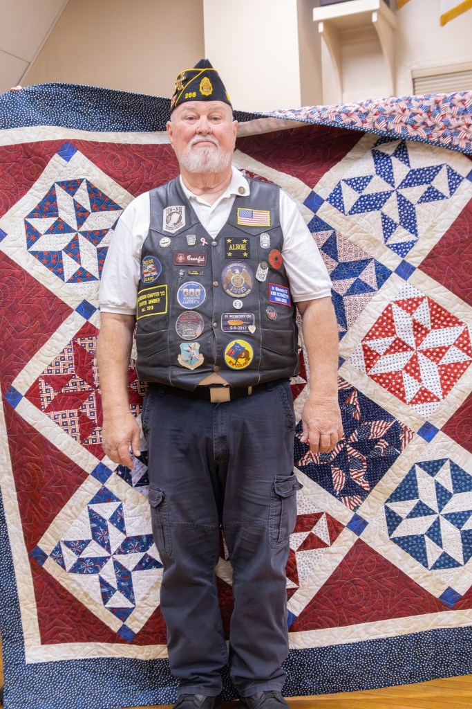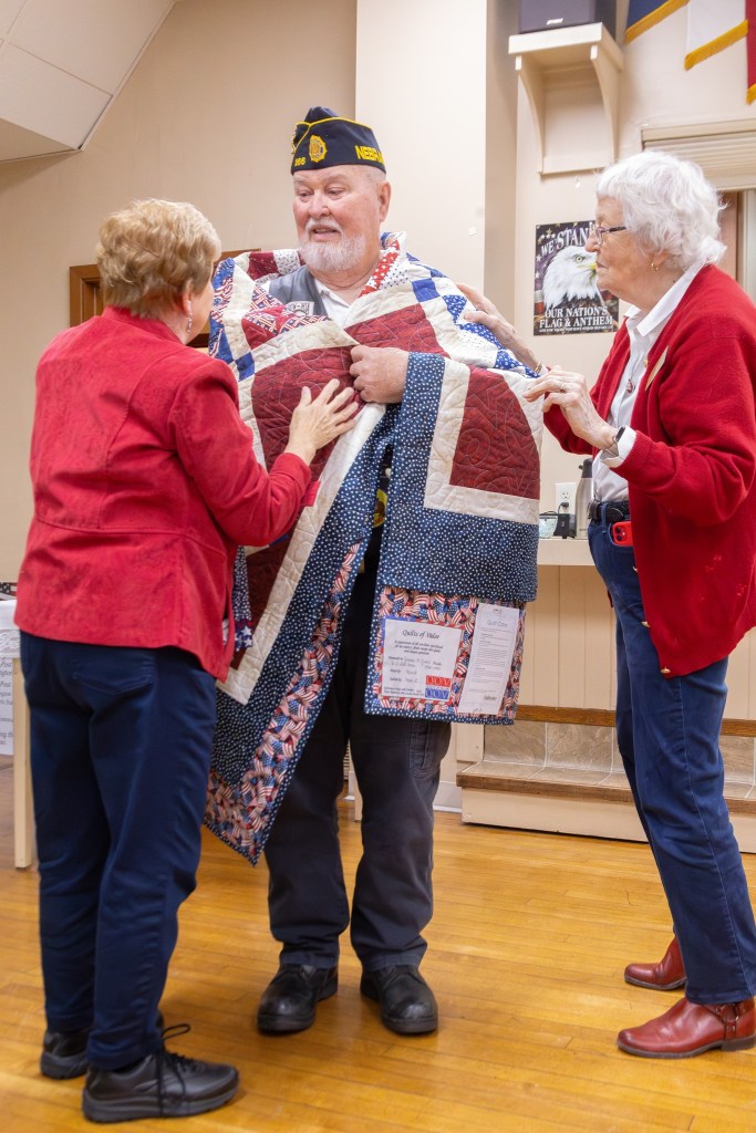 Three veterans — Les Brauer (Army), Jim Cheek (Air Force), and Jeremy Edens (Marine Corps) — were each presented with a Quilt of Valor, a handmade quilt awarded to veterans and service members “touched by war.” These quilts are given as a tangible symbol of comfort and gratitude for their sacrifice. Representative Bill Robinson shared that over 420,000 quilts have been awarded to deserving veterans nationwide.