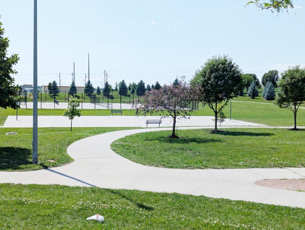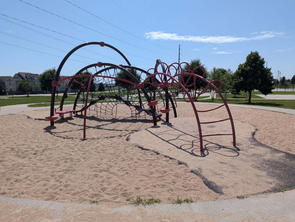 The park boasts two playgrounds tailored to different age groups. The larger playground features both a classic play structure and a modern rope climbing structure that challenges older kids to test their agility and strength. Nearby, a smaller toddler-friendly playground ensures younger children can play safely. Other features of the playgrounds are low monkey bars, a digger, ride-on toys and a seesaw. Swings add to the fun, inviting kids to soar under the Nebraska sky.
