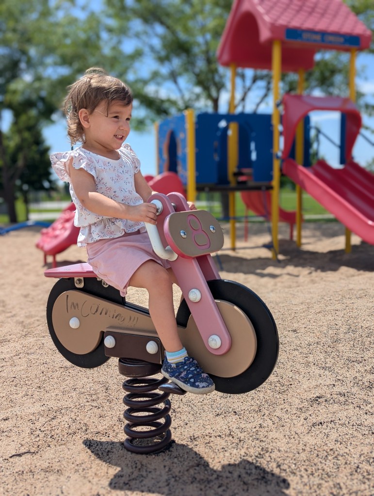 Lyra Dawson, age 2, enjoys the ride-on toys and toddler play area.