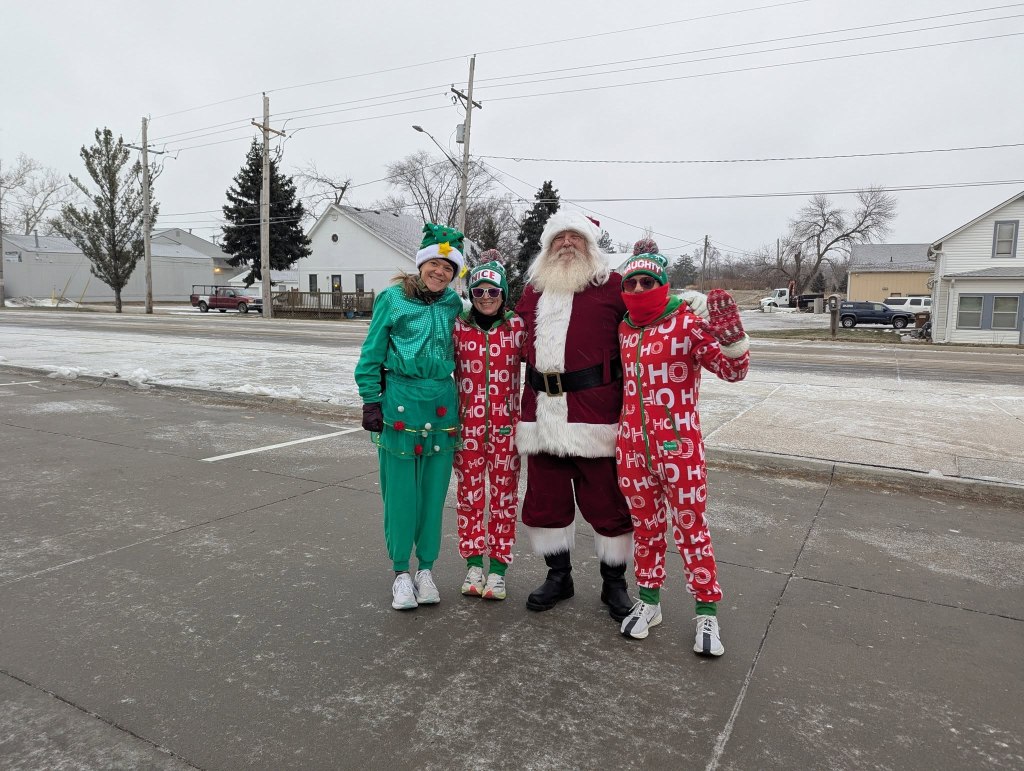 Despite the chilly single-digit temperatures and steady snowfall this morning, the Bennington Running Club’s first annual Toy Drive Christmas Run drew a small but dedicated turnout of runners. Participants gathered at Bennington Elementary at 8am, bringing unwrapped toys to donate to the Open Door Mission for children in need this holiday season. The festive 5K route headed west on the trail along Bennington Road, through snow-covered trails into Newport Landing, and back to the school. Santa Claus himself came down from the North Pole, cheering runners at both the start and finish lines, while some participants added to the fun by dressing in holiday costumes.
