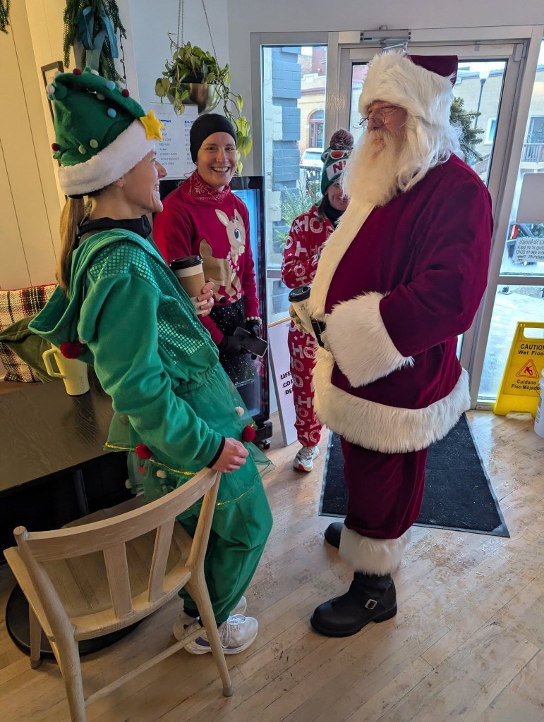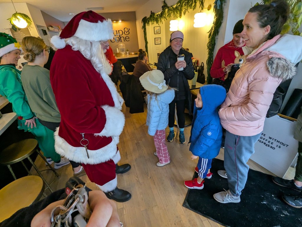 After crossing the finish line, runners, families and even Santa made their way to Cup & Cone for a warm post-run gathering. Everyone enjoyed fresh pastries, hot drinks, and quality time visiting with Santa, creating a delightful surprise for other locals stopping by the shop.