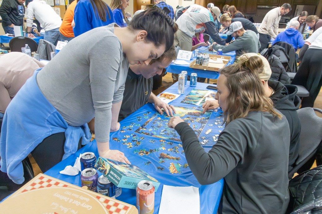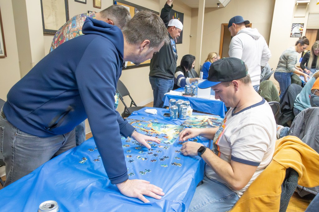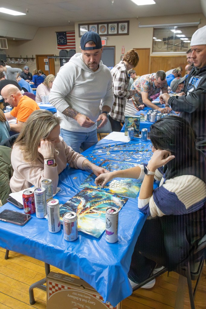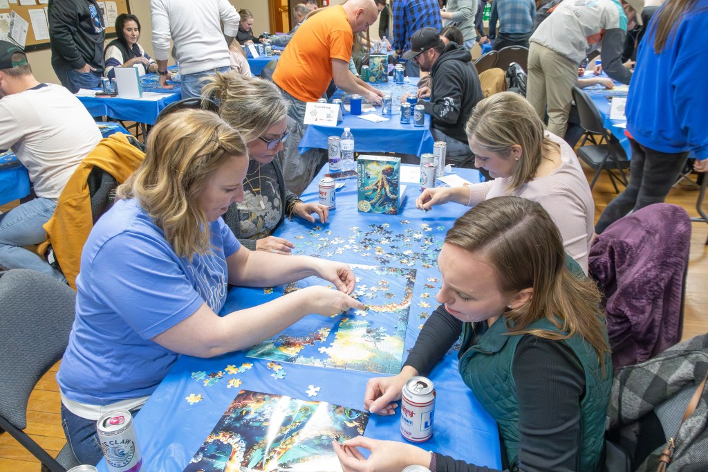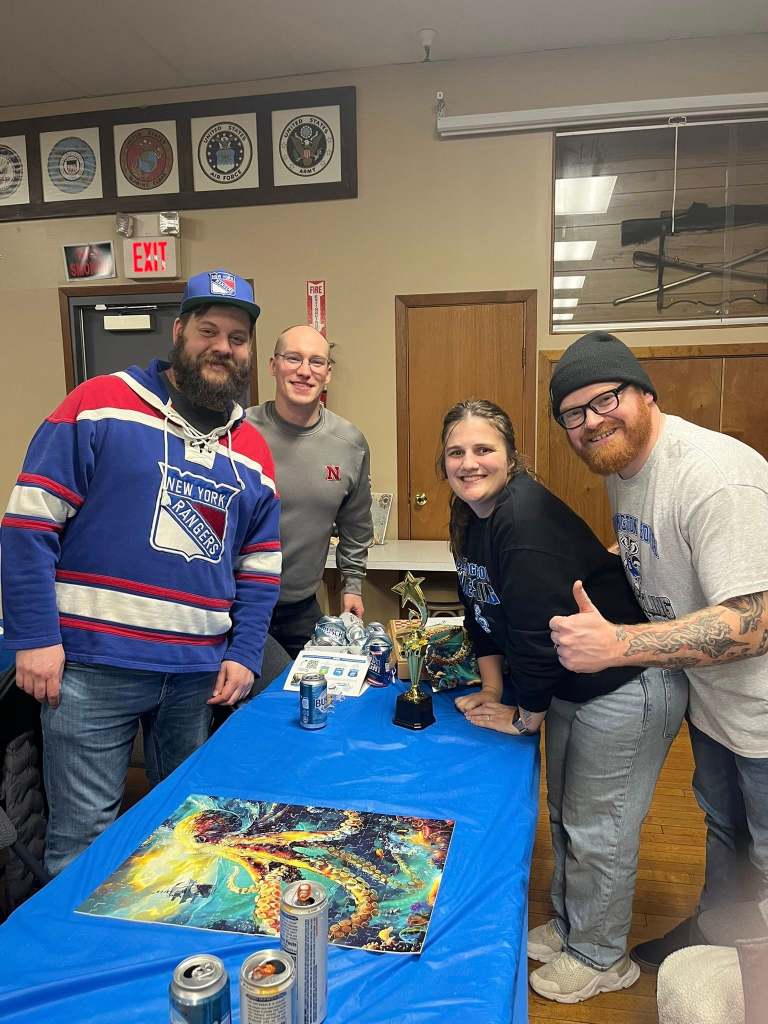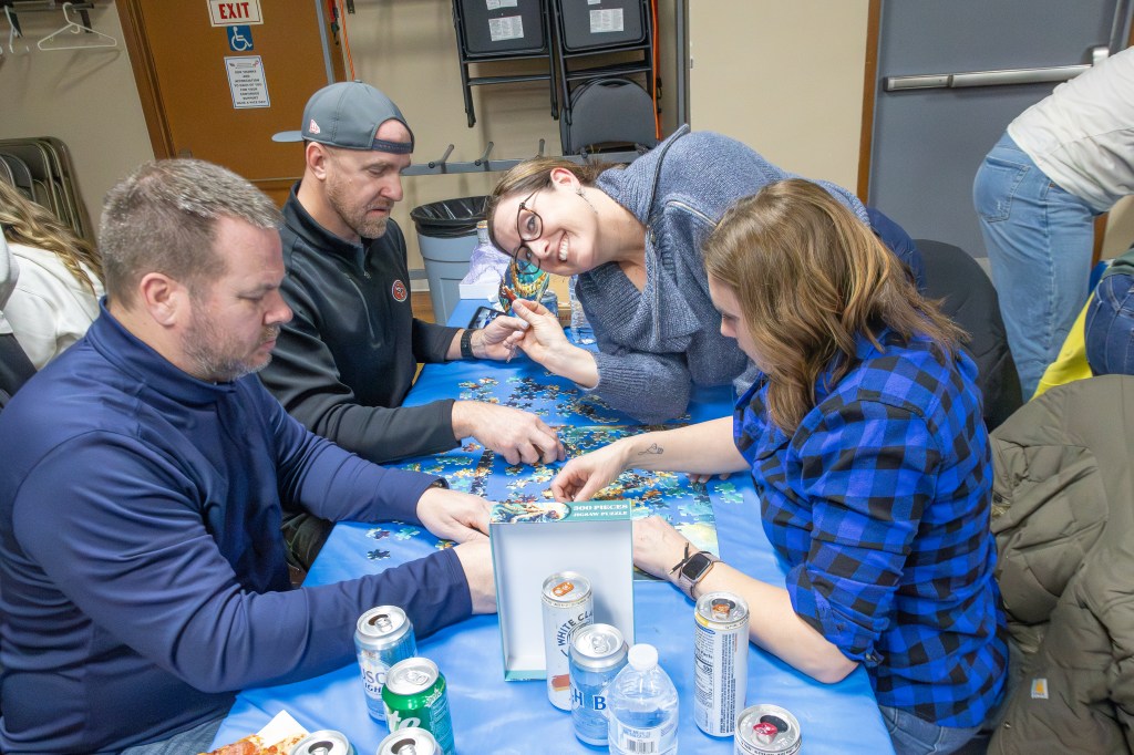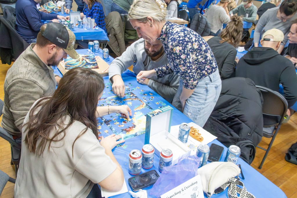 The event took place at the Bennington Legion Hall, with one session on Friday night and two on Saturday (one early evening and one later). Teams of four raced to complete three challenges: assembling a 300-piece puzzle, eating a large pizza, and finishing a 12-pack of beer/seltzer (or non-alcoholic options). The fastest team to finish all three took the win, but the unpredictable Wheel of Chaos kept everyone on their toes.