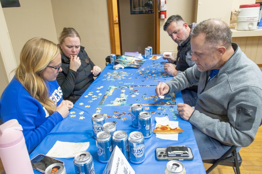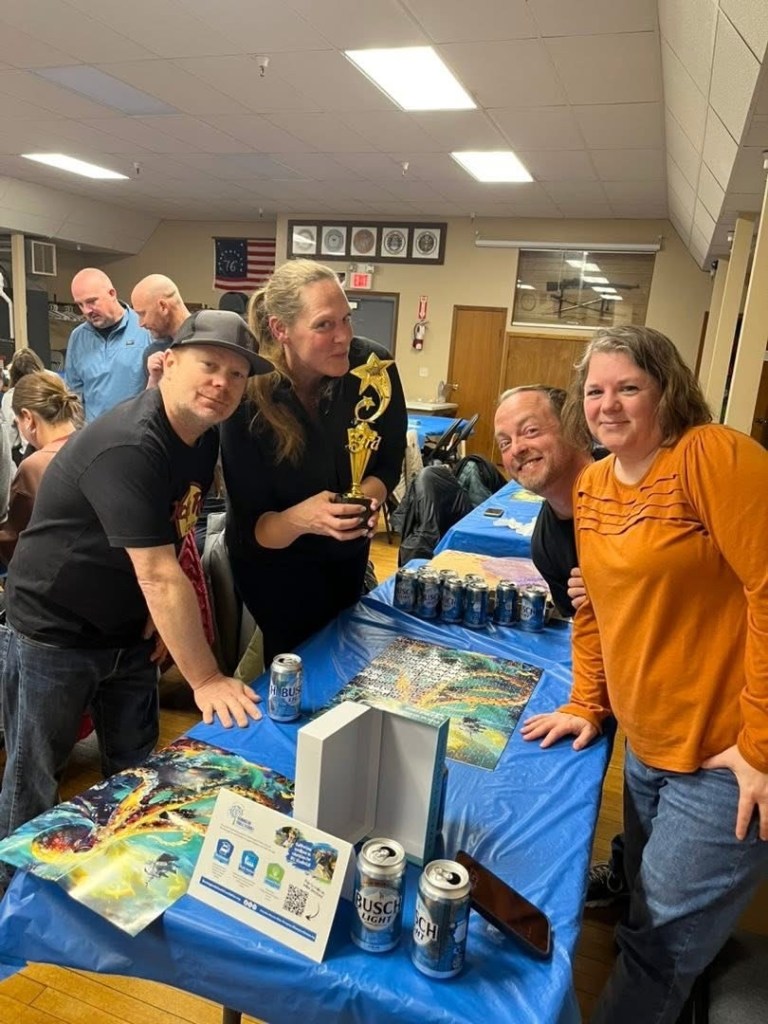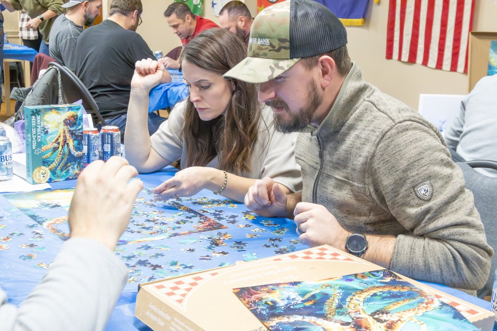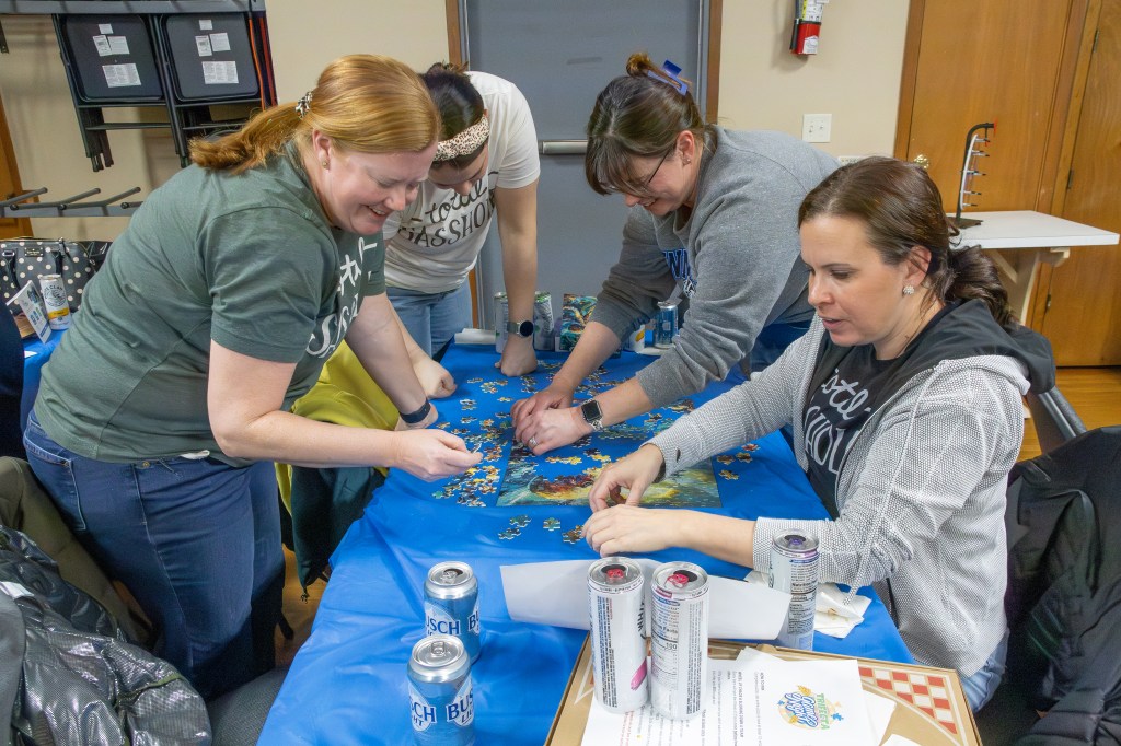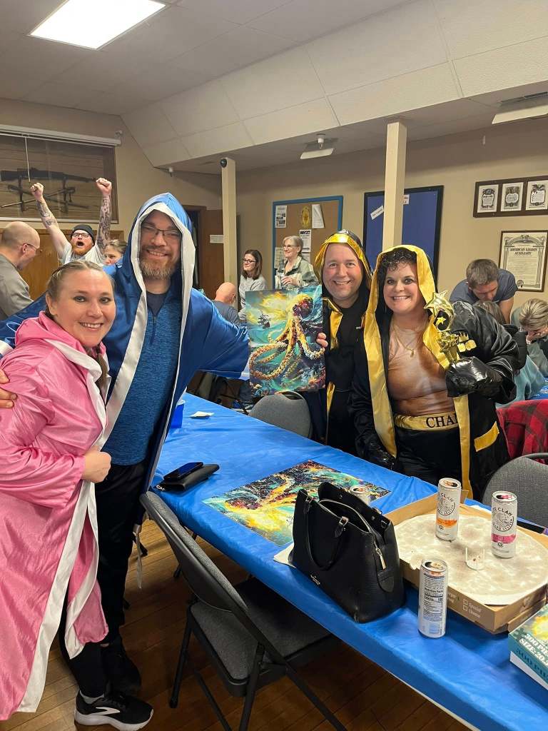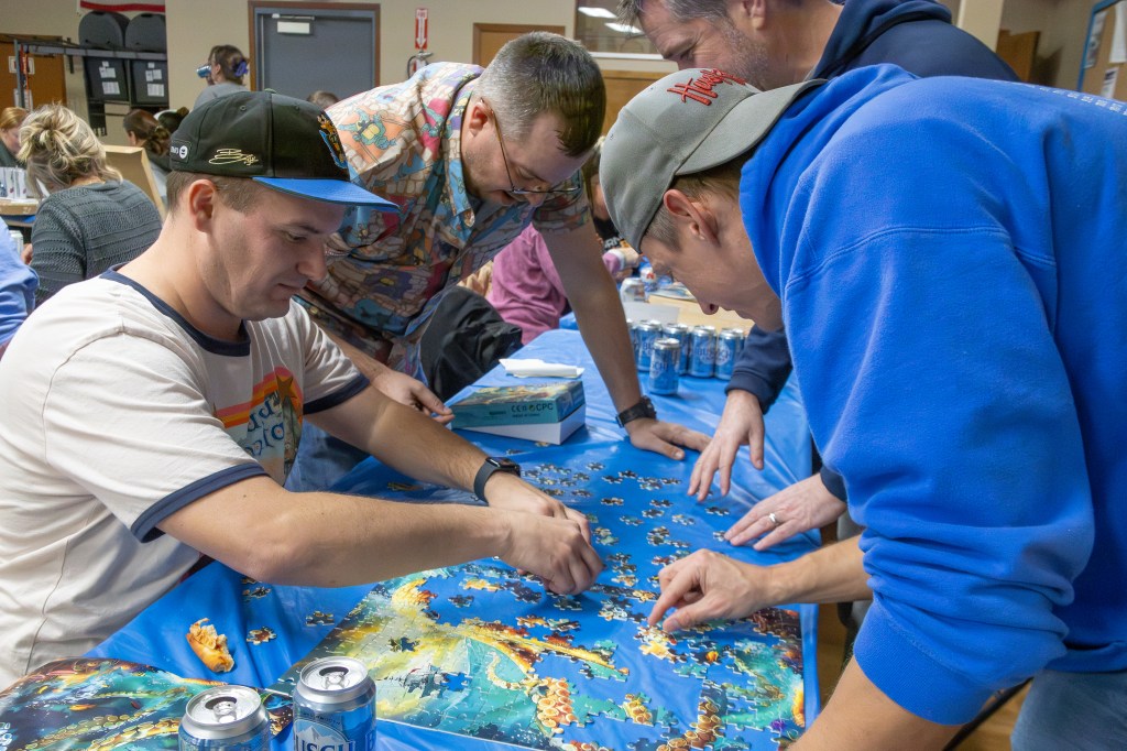 The event took place at the Bennington Legion Hall, with one session on Friday night and two on Saturday (one early evening and one later). Teams of four raced to complete three challenges: assembling a 300-piece puzzle, eating a large pizza, and finishing a 12-pack of beer/seltzer (or non-alcoholic options). The fastest team to finish all three took the win, but the unpredictable Wheel of Chaos kept everyone on their toes.