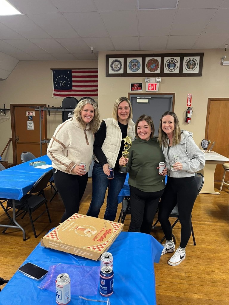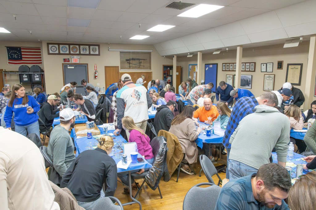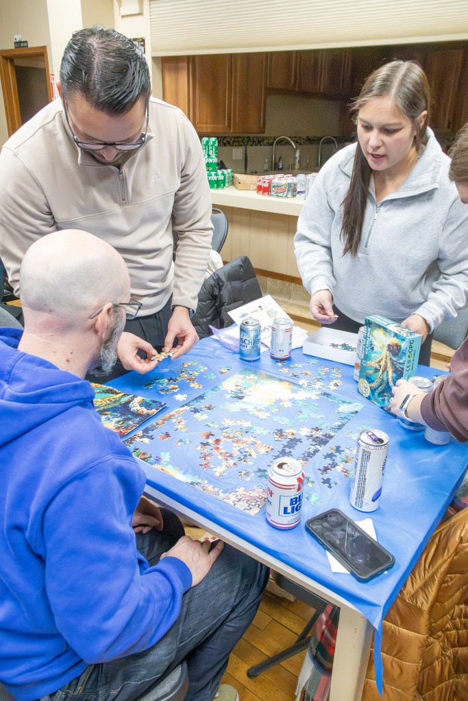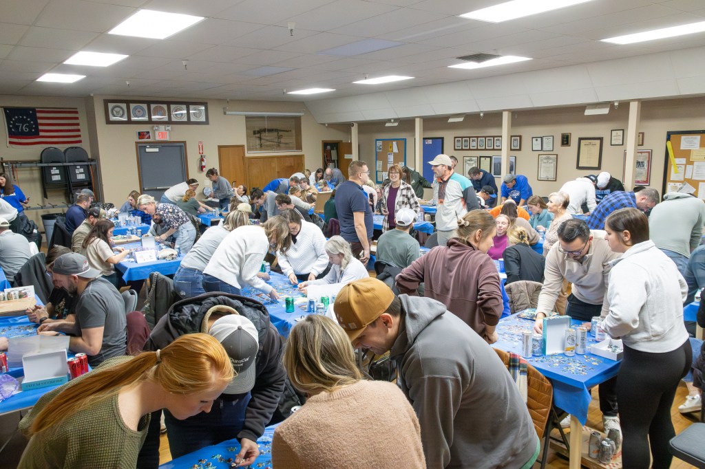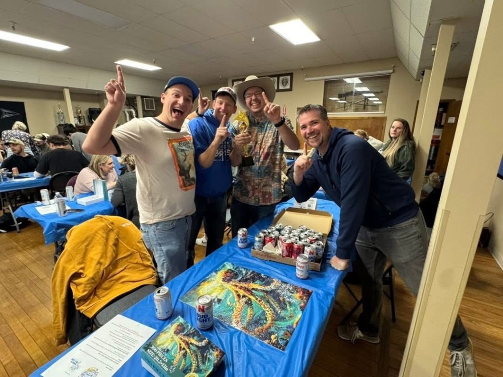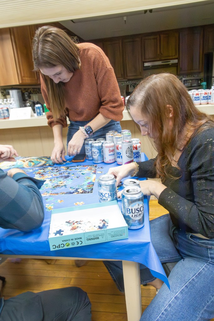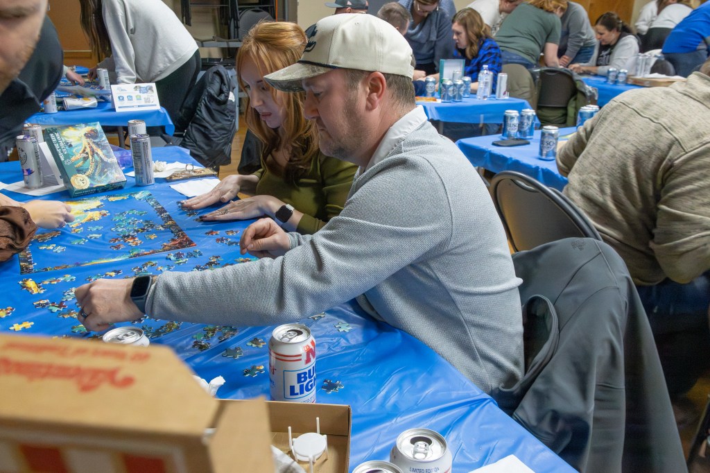 The event took place at the Bennington Legion Hall, with one session on Friday night and two on Saturday (one early evening and one later). Teams of four raced to complete three challenges: assembling a 300-piece puzzle, eating a large pizza, and finishing a 12-pack of beer/seltzer (or non-alcoholic options). The fastest team to finish all three took the win, but the unpredictable Wheel of Chaos kept everyone on their toes.