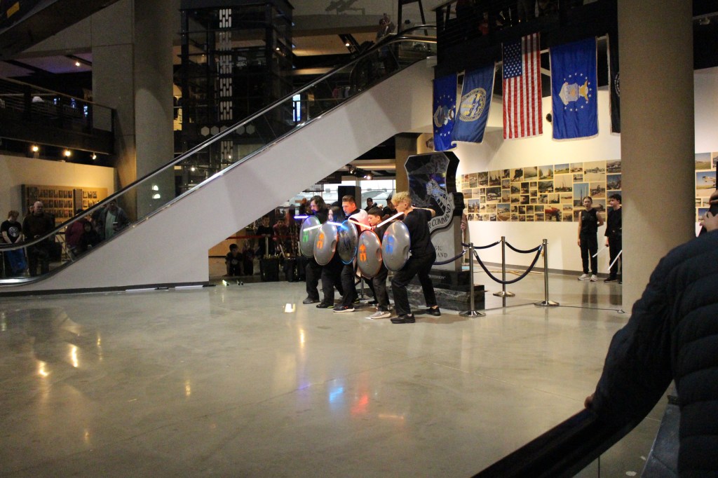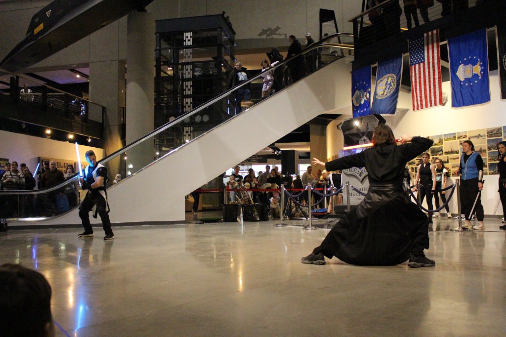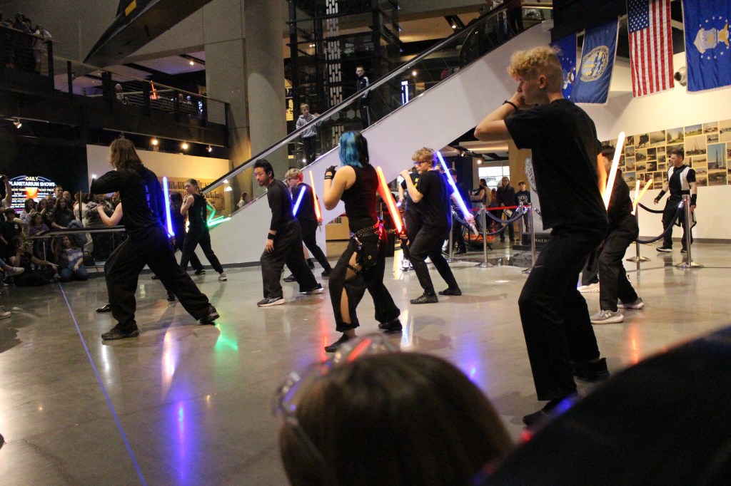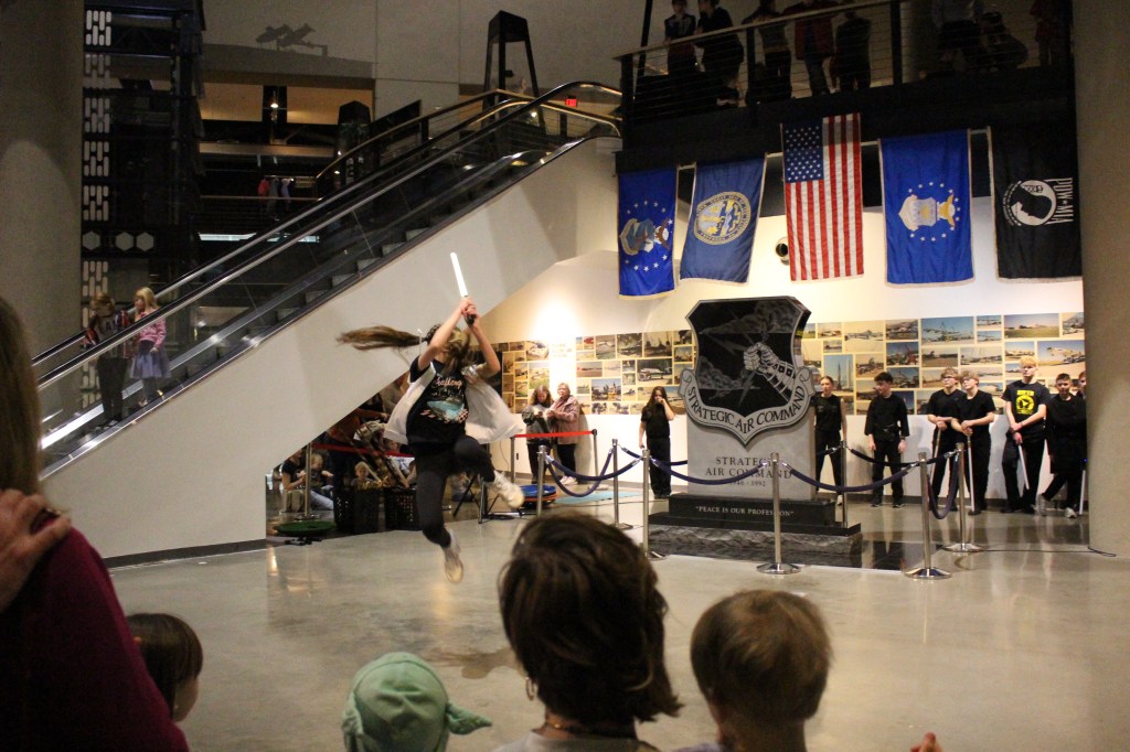 Jake recalled an impromptu trip to the SAC Museum with his family. While exploring the planes and space exhibits, he made a comment to his daughter: “You know what would be really cool is if I brought some of my lightsaber students up here and we did a demonstration.” An employee overheard the conversation and approached him about the upcoming Star Wars exhibit. This led to more conversations and ultimately the performance came together with collaboration from multiple RWTB locations.