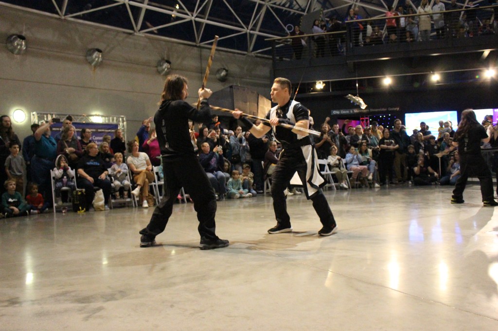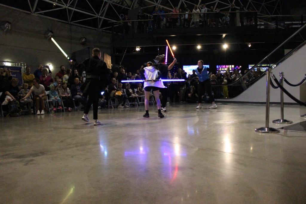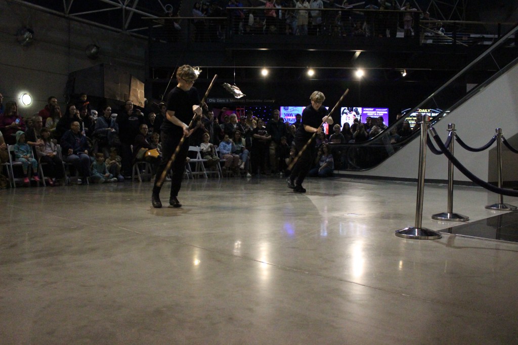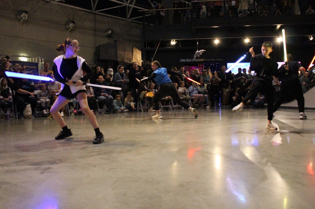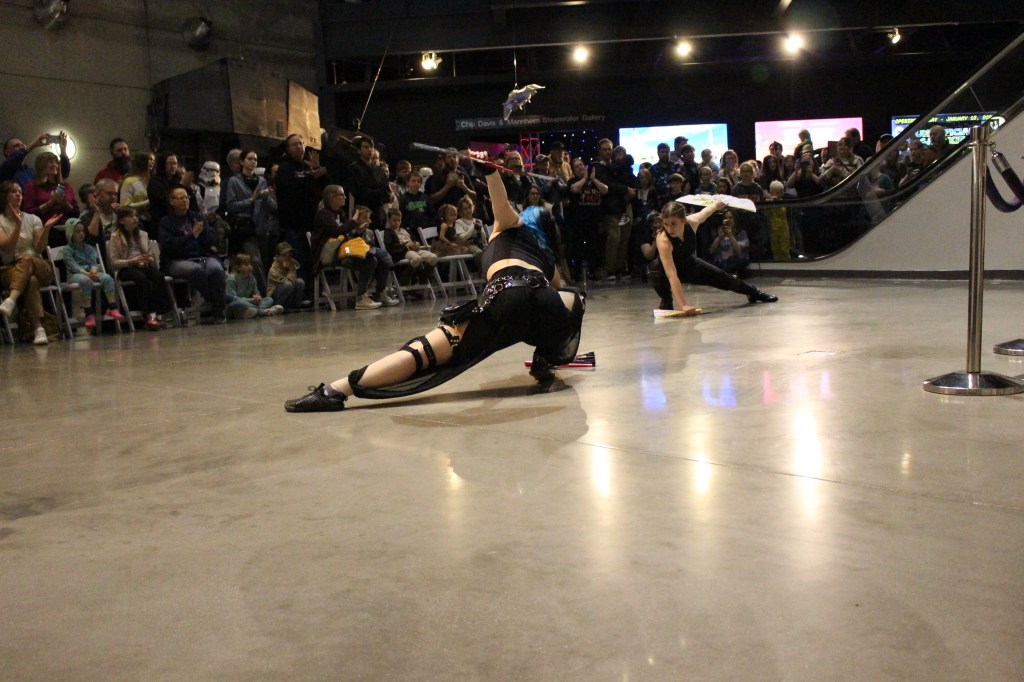 Jake recalled an impromptu trip to the SAC Museum with his family. While exploring the planes and space exhibits, he made a comment to his daughter: “You know what would be really cool is if I brought some of my lightsaber students up here and we did a demonstration.” An employee overheard the conversation and approached him about the upcoming Star Wars exhibit. This led to more conversations and ultimately the performance came together with collaboration from multiple RWTB locations.