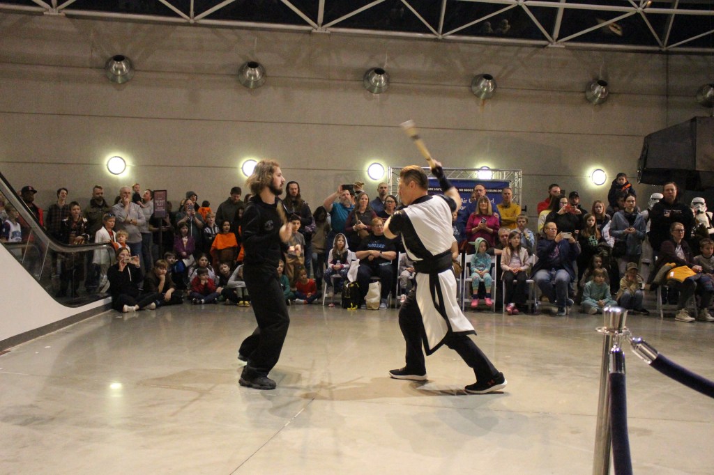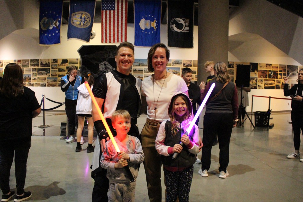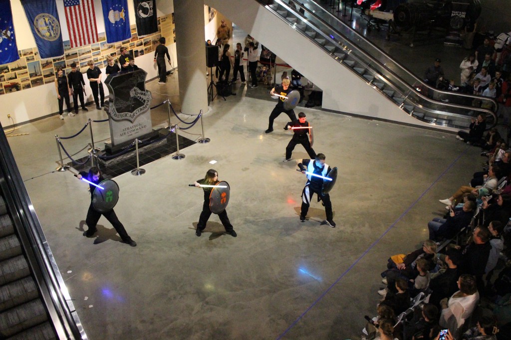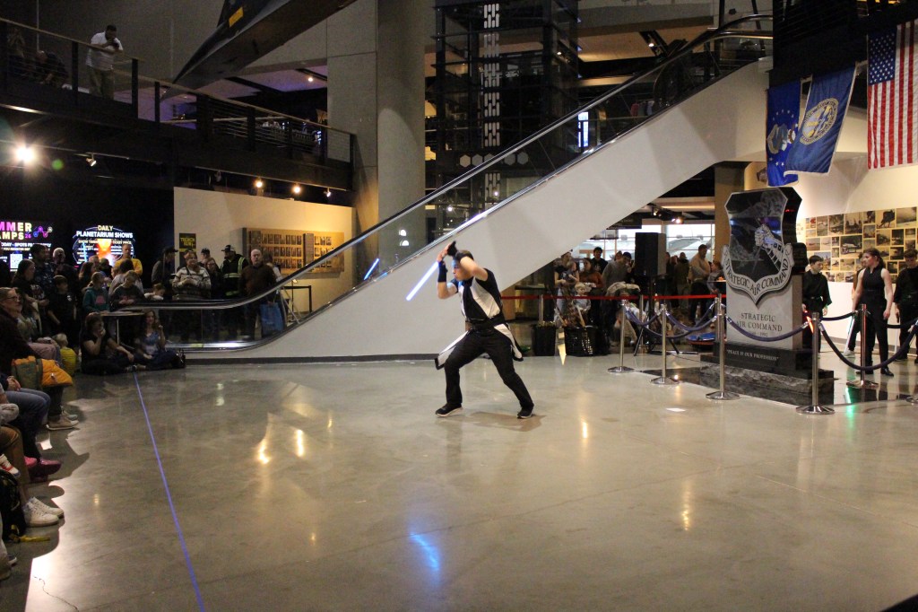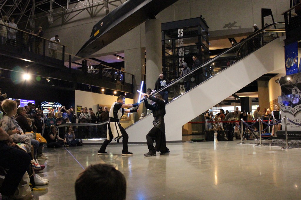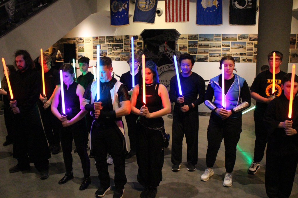 Black Belts Jake and Katie Nielsen of Rosenbach Warrior Training Branch (RWTB) in Bennington led an impressive lightsaber demonstration at the Strategic Air Command & Aerospace Museum in Ashland last Thursday evening, tying perfectly into the grand opening of the new traveling exhibit “Unofficial Galaxies.”