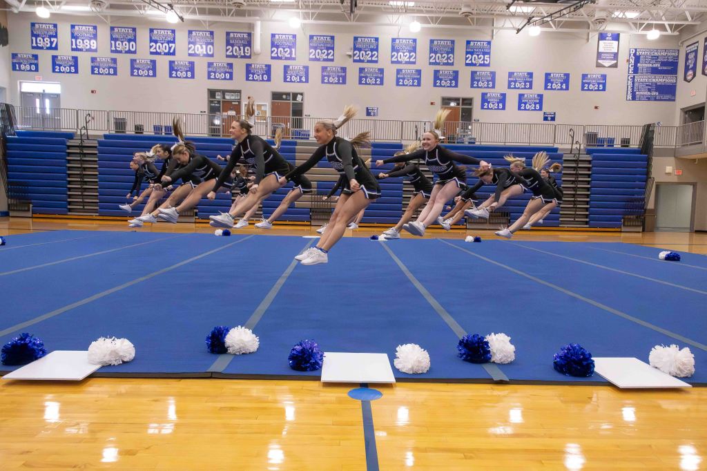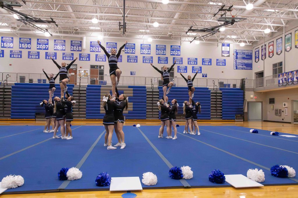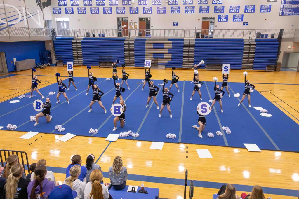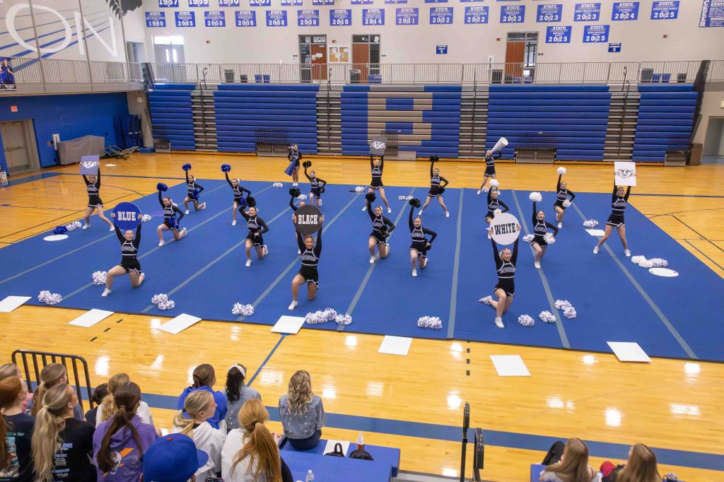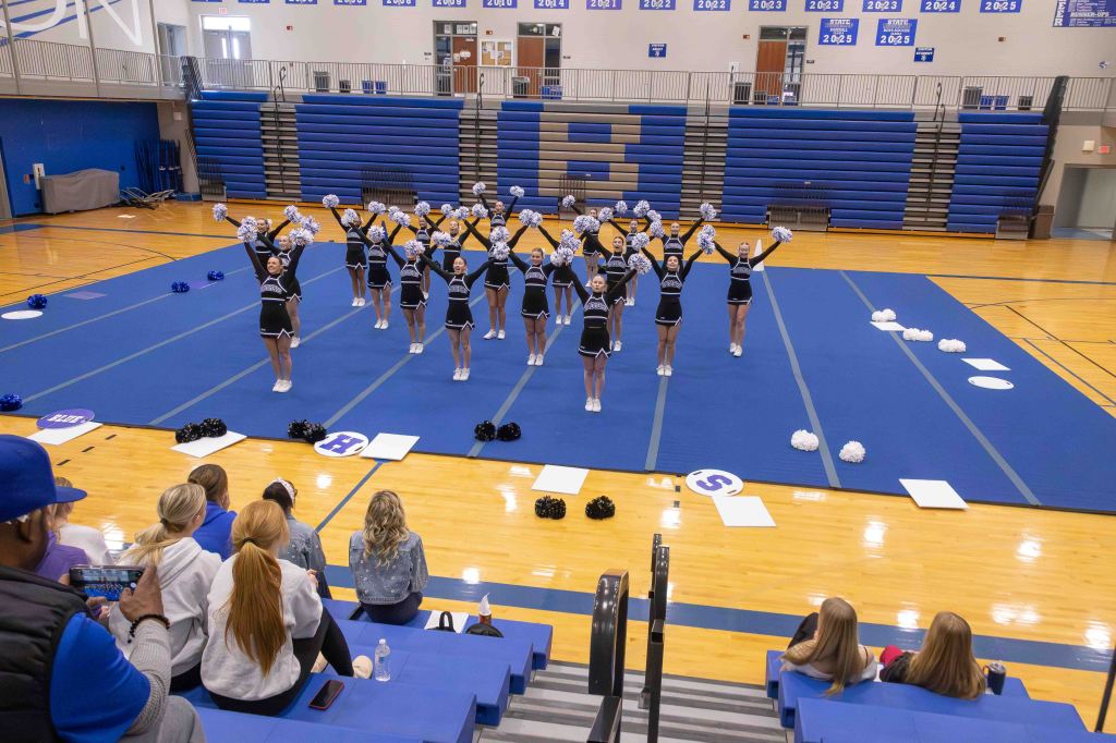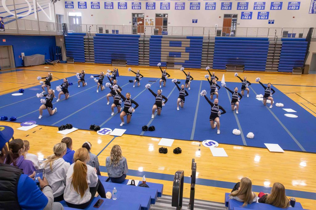 On Saturday, in the lead-up to the competition, the team hosted a special cheer send-off event for community members and families. They performed their full routines, including both their non-building non-tumbling and traditional categories, giving supporters a preview of what they’ll bring to state.