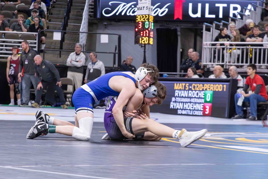 – Brayden Kreikemeier secured a quick pin, taking down Zane Wesely (Wahoo) by fall in 1:50.