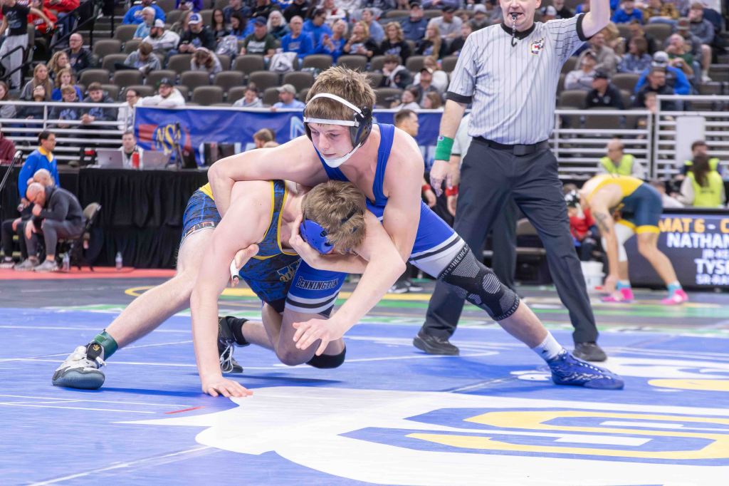 The quarterfinals followed, with Bennington going 5-5 among the 10 advancers to reach the semifinals: Brodee Scobee, Brayden Kreikemeier, Paxton Morgan, Ty Bouaphakeo, and Ty Thomsen. Several others fell in tight or competitive bouts, and will go on to wrestle in the consolation rounds again tomorrow.