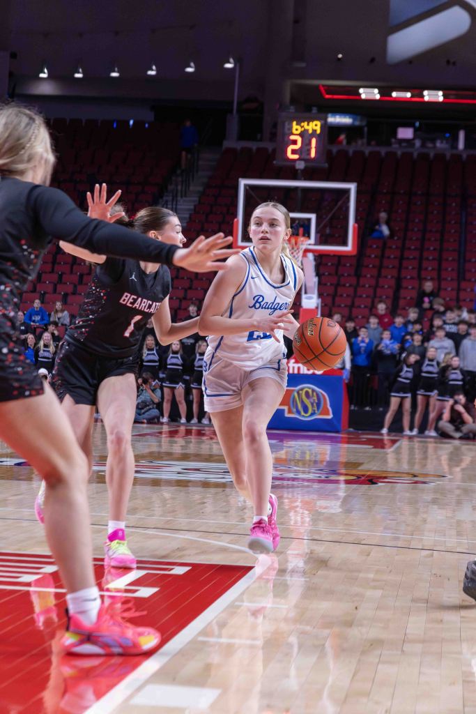 The Bennington Badgers girls basketball team advanced to the Class B semifinals of the 2026 NSAA State Tournament with a 62-42 victory over the Scottsbluff Bearcats on Thursday night at Pinnacle Bank Arena in Lincoln.