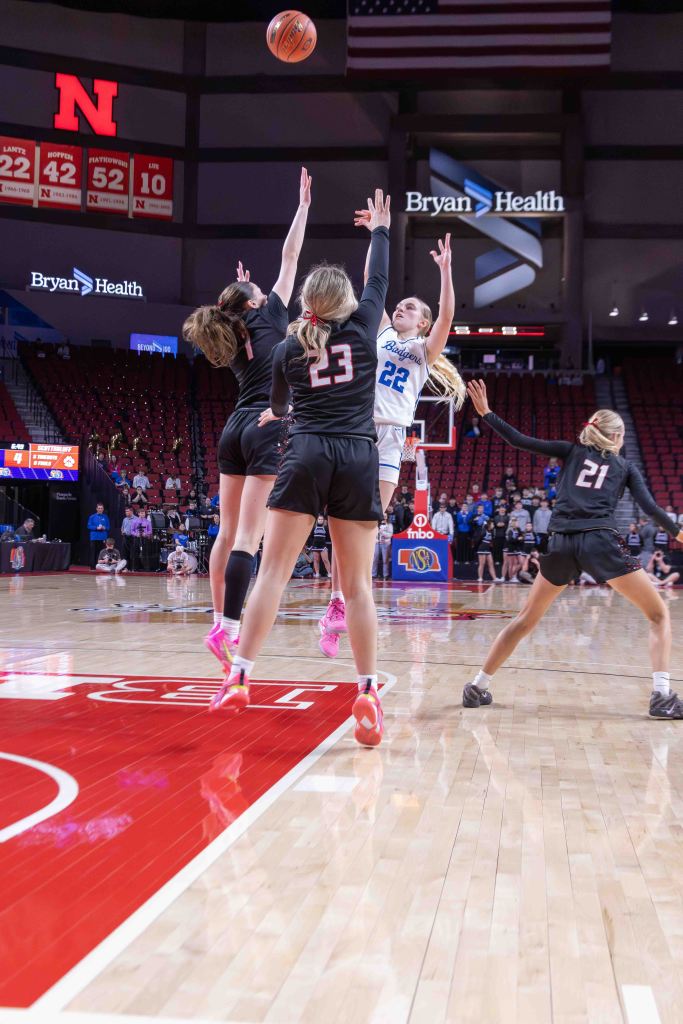 “A lot of respect to Scottsbluff, they’re a very good team,” O’Connor said to start. “We knew coming down to the state tournament, obviously you’re going to play tough teams and close games. I thought our girls weathered some foul trouble and how to keep our composure again. Scottsbluff is a very physical team, so we had to answer that physical part of it. I thought our girls did a good job in the second half.”
