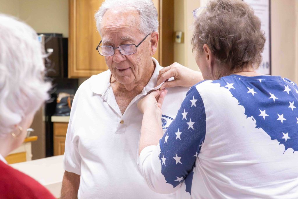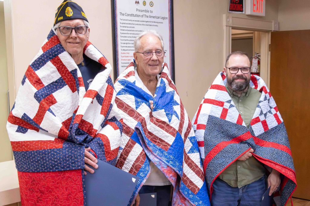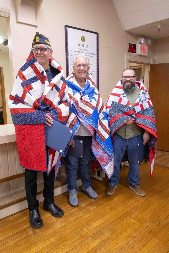 Following the pinning, handcrafted Quilts of Valor were awarded to Jim Coles, David Harkin and Frank Mann. Each veteran also received a challenge coin presented by Legion member Jim Cheek.
